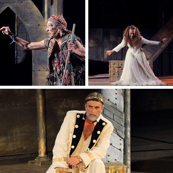 Dall'alto a sinistra: Carla Cassola, Giulia Sanna e Massimo Venturiello in "Antigone"