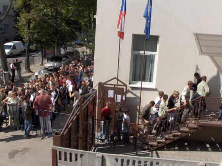 يبدأ اليوم في الساعة السابعة والنصف صباحا أمام الباب المصفح ، حيث نجد شخصين أو ثلاثة ، وبحكمة ، ينتظرون بالفعل في طابور واحد . في النهاية ، حوالي الساعة التاسعة يُفتح الباب ، ونمر من ممر الأمن ، ويعطونا تذكرة ، وعلى الفور نجد أنفسنا أمام الخزينة : يُدفع مبلغ 60 يورو ، ولا يُعرف ما إذا كانت ستُمنح التأشيرة أم لا .