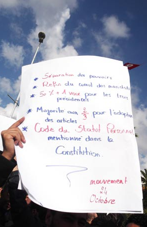 على الرغم من حجمها العددي الضئيل، توصلت المعارضة إلى القيام بدور نشيط و إن كانت آلية التصويت قوتها لا تكاد تغلب. و سنحاول فيما يلي استعراض بعض الجولات من هذه المعركة السياسية لنتبين بصورة أوضح الرهانات و كذلك التصميم الذي تبديه مختلف الأطراف. الجولة الأولى : المجلس التأسيسي يمنح ثقته للحكومة وله الحق في إصدار لائحة لوم يصوت عليها بالأغلبية المطلقة عملا بقاعدة توازي الأشكال. وهذا خلافا لما جاء في مشروع الائتلاف والذي كان ينص على أن الثقة تمنح للحكومة بالأغلبية المطلقة ولا تسحب منها إلا بأغلبية الثلثين. وفي ذلك بعض التعديل بالنظر إلى أن النهضة لها أكثر من 41% من مجموع المقاعد أي أكثر من ثلث النواب. الجولة الثانية: نص الدستور المؤقت الذي أعده ائتلاف الأحزاب الثلاثة على أن رئيس الجمهورية يرسم مع رئيس الحكومة خطوط السياسة الخارجية للبلاد. و هو القائد الأعلى للقوات المسلحة. و لا يعين الرئيس أو يعفي كبار الضباط "إلا بموافقة رئيس الحكومة". لكن النص الذي اعتمده المجلس في النهاية لا يشترط "موافقة" رئيس الحكومة بل "التشاور" بين الرجلين. الجولة الثالثة: من أهم ما يطالب به المعتصمون، تنظيم استفتاء شعبي للمصادقة على الدستور النهائي. و لئن لم يقع قبول هذا الطلب، فإن الصيغة التي أقرها المجلس التأسيسي تختلف على تلك التي عرضها الائتلاف و التي تنص على أن تتم المصادقة على الدستور بأغلبية الثلثين في القراءة الأولى، و بالأغلبية المطلقة في القراءة الثانية. ويقضي الدستور المؤقت الذي تم اعتماده بإجراء استفتاء شعبي كاختيار ثالث إذا لم تتم المصادقة على الدستور النهائي بأغلبية ثلثي الأصوات في القراءة الأولى و الثانية.