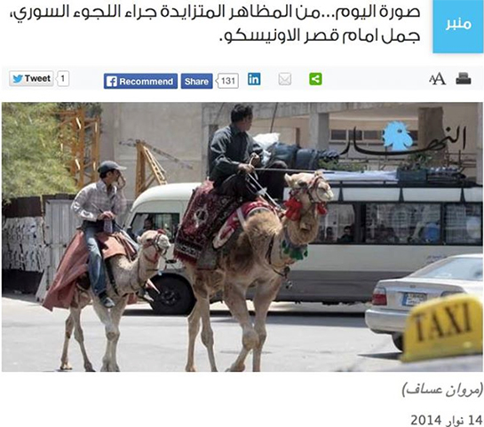في أحد الأيام أيضاً، نشرت إحدى الصحف المعروفة في لبنان صورة جمل يذرع شوارع العاصمة وكُتب تحت الصورة: "من الظواهر المتزايدة جراء اللجوء السوري، جمل أمام قصر الأونيسكو!". أثارت الصورة ردود أفعال غاضبة وصلت إلى حد طلب مقاطعة الجريدة من قبل المثقفين السوريين الذين اعتادوا أن ينشروا مقالاتهم فيها. صحيح أن أحد الصحفيين وضّح في اليوم التالي أن الجمل المذكور يملكه أحد أبناء بيروت، وهو يُستخدم لأغراض سياحية، إلا أن هذه الصورة والتعليق المنشور تحتها بيّنت إلى أي حد كانت الأفكار المسبقة السيئة عن السوريين قوية، إذ يُنظر في لبنان إليهم كأناس بدائيين ومتوحشين بلا تربية يلوثون أرض الثقافة والحضارة!