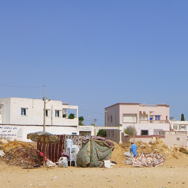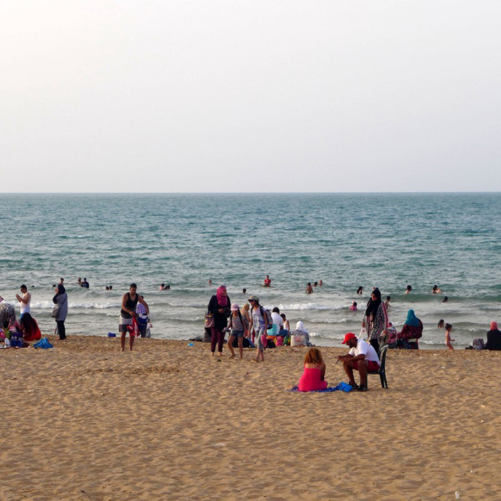 La plage, en Tunisie, c’est d’abord une aventure en famille, avec : les couffins que l’on rempli de casse-croûtes, de sodas, de pastèques… Les voitures dans lesquelles on s’entasse avec des foutas, des parasols, des chaises en plastique, des glacières…