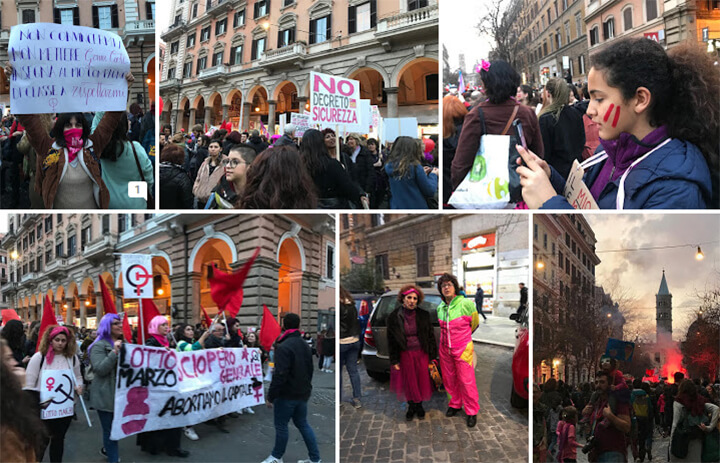 Malgré la noirceur de ce tableau, c’est une foule allègre, multicolore, mixte, jeune… qui s’ébroue de piazza Vittorio, haut lieu de la diversité culturelle romaine, vers Piazza Venezia. Le mot d’ordre de la manifestation « Lotto marzo » - jeu de mot fonctionnant sur la polysémie de « Lotto » (je lutte) et « l’otto » (le Huit)- a de toute évidence fait brèche et sensibiliser un nombre impressionnant de personnes.