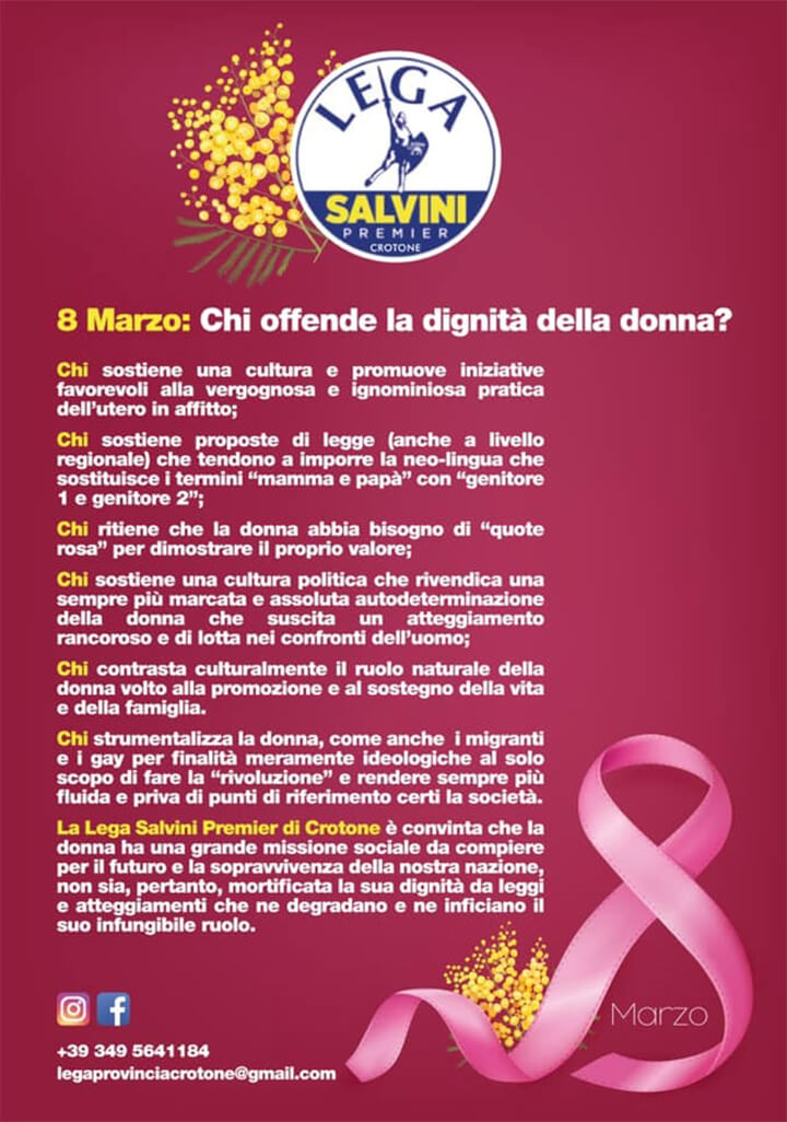 Les mauvaises surprises n’arrivent jamais seules. A la veille du 8 mars un nouvel incident s’est vérifié dans les rangs de la Lega Nord où les élus peinent visiblement à dissimuler le langage raciste, misogyne et décomplexé auquel leur leader les a habitués. Pis : c’est une idéologie ouvertement fasciste qui se déploie en toutes lettres sur le tract diffusé par la Lega de Crotone (Calabre). Y sont exaltés «Le rôle naturel de la femme voué à la promotion et au soutien de la vie et de la famille» et «la grande mission sociale qu’elle doit accomplir pour l’avenir et la survie de la nation». Y est a contrario fustigée «ceux qui soutiennent une culture politique qui revendique une autodétermination de la femme de plus en plus forte et absolue suscitant un comportement de rancune et de lutte à l’égard de l’homme».
