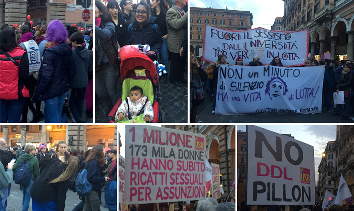 Il faut dire que la mobilisation était à la mesure de la situation alarmante que vivent les Italiennes. Les chiffres parlent tout seuls : selon l’Istat, en Italie une femme sur trois entre 16 et 70 ans a été victime de violence commise par un homme, 7 millions de femmes ont subi des violences physiques et sexuelles tandis que chaque année quelques environ 150 femmes sont tuées par leur mari, petit copain ou ex. Le chômage des femmes (44%) est de 20% plus important que celui des hommes. La différence salariale de genre prospère tandis que 2.472.000 femmes sont plongées dans la pauvreté absolue.