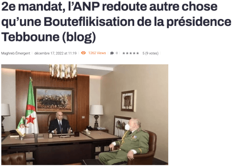Tous les indicateurs montrent bien que Abdelmadjid Tebboune a rempli aux tests de loyauté et qu’il bénéficie du soutien de l’armée pour briguer un 2e mandat. Il n’a pas réellement cherché à construire une force politique propre à lui. Il exerce certes son pouvoir sur la quasi totalité des prérogatives que lui donne la constitution hyper-présidentielle du 1er novembre 2020, mais sans velléités de réduire l’exposition de l’ANP comme pilier du pouvoir politique en Algérie. Il n’a pas reconstitué une police politique puissante en face de l’Etat Major, bicéphalisme qui avait permis à son prédécesseur de jouer sur les divisions et de s’aménager un avantageux rôle d’arbitre.