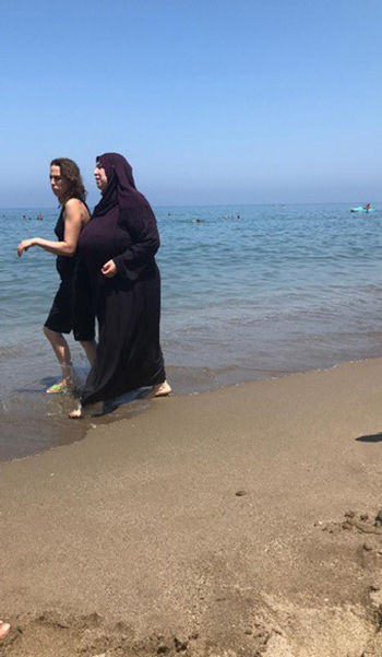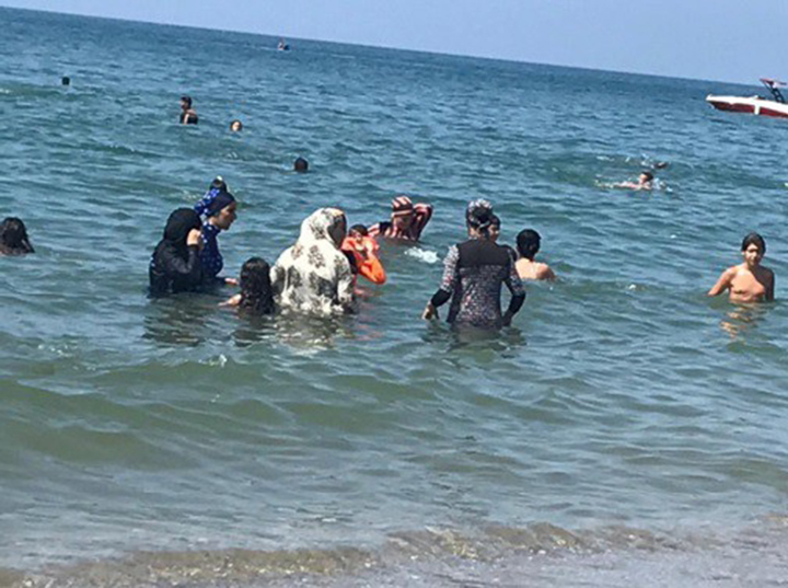 Bon c’est vrai il y a les « hadjoubis » qui gâchent un peu le décor.Elles barbotent avec le niqab par cette chaleur alors que leur mari,lui est en short et torse nu. Enfin chacun fait ce qu’il veut. Je reconnais que si on va pas en maillot dans leur espace, les barbus ne se mêlent pas de nos affaires. Ils sont là-bas dans la crique. Beaucoup viennent de l’intérieur du pays d’après les immatriculations de leurs voitures. Ils sont de leur côté et nous du nôtre. On a entendu quelques histoires de femmes insultées parce qu’elles se promenaient en maillot sur leur plage. Je trouve que chacun doit respecter les opinions de l’autre. Si une femme veut porter le voile sur la plage c’est son problème.