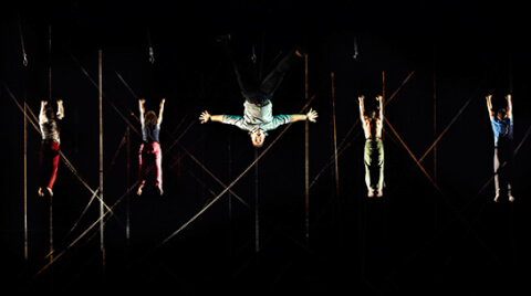 Il y a aussi les pyramides humaines, les acrobaties, le jeu du clair-obscur, ils se balancent dans le vide, ils sont foule, ils deviennent un seul corps, ils se fondent en un seul corps entre les jeux de voile en fond de scène, c’est la mer, c’est le vent, c’est le souffle humain….La présence de lignes médianes, bissectrices, carrés, rectangles, corps incrustés au mur dans des postures assises ou accroupies, ou fœtales, allongés au plafond comme en apesanteur, décollées par l’énergie de la lumière…