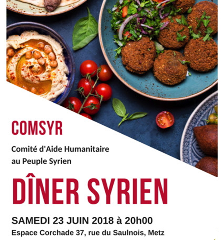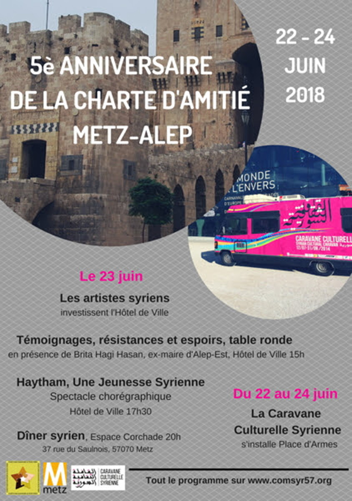 A l'occasion du 5e anniversaire de la charte d'amitié signée entre Metz et Alep, la ville de Metz et l'association Comsyr (Comité d'aide humanitaire au peuple syrien) organisent un week-end syrien avec une exposition des artistes de la Caravane culturelle syrienne sur la place d'Armes pendant tout le week-end et une journée officielle à l'hôtel de ville le samedi 23 juin.
