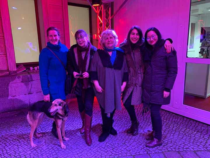 Une équipe au féminin : de droite à gauche: La monteuse de CLEBS, Xi Feng; Halima Ouardiri, Michèle Augsburger, Regina Keil-Sagawe (traductrice-interprète) et Yvonne ... avec sa chienne Lara, représentante des 750 Beldis de CLEBS, adoptée il y a deux mois et qui vit depuis avec Yvonne à Berlin.