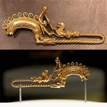 Se trata de la fíbula Braganza, un extraordinario broche de oro que en otro tiempo debió de adornar la indumentaria de algún príncipe ibérico. Los expertos establecen la fecha de su realización entre los siglos IV y III a.C., obra probablemente de un anónimo y errante artesano de origen griego. La filigrana de la fíbula ofrece una representación bella y sintética de la visión del mundo propia de este período. En ella conviven la serpiente oceánica, cuyo lomo es surcado por el oleaje, el jabalí espiritual e inframundano, y un guerrero desnudo que se enfrenta y somete con una espada a un lobo de dos cabezas. La exposición se complementa con otras piezas más o menos contemporáneas, que explicitan el entorno material e imaginativo de la Fíbula Braganza. Según el Diccionario de símbolos de Juan Eduardo Cirlot, “la lucha contra el monstruo significa el combate por liberar a la conciencia apresada por el inconsciente”. Esta escena constituye uno de los mitos centrales de todas las culturas humanas. Ha pervivido en la iconografía religiosa, en algunas fábulas tradicionales y en la obra de grandes escritores como Melville o R. L. Stevenson. Buena parte de los actuales estrenos de cine de terror, con resultados más o menos felices, recurren al mismo esquema narrativo.