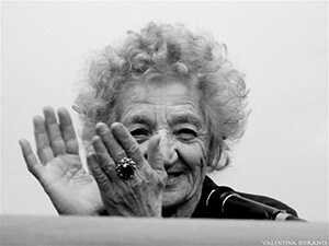 Seppur con le spalle ricurve e un viso segnato da una vita di intense emozioni, Cecilia Mangini ha ancora l’energia e la freschezza di una ragazza. Incorniciati da una nuvola di riccioli bianchissimi, i suoi grandi occhi si spostano curiosi a perlustrare ogni angolo della stanza, incrociando lo sguardo del pubblico, tra saluti e sorrisi.
