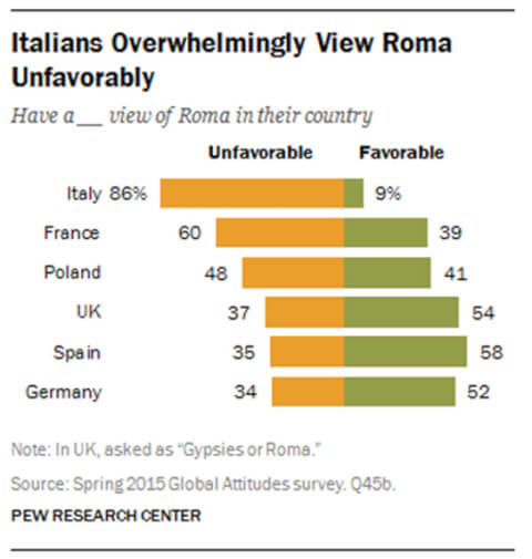 Italians, in particular, hold strong anti-Roma views, with 86% of Italians expressing negative opinions about Roma. In France 60%, in Poland 48%, in the UK 37%, in Spain 35%, and in Germany 34% have an unfavourable view of Roma.