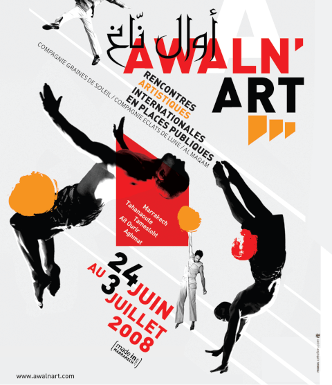 Du 24 juin au 03 juillet 2008, Marrakech et la Province Al Haouz, accueillent les deuxièmes Rencontres Artistiques Internationales en Places Publiques Awaln’art. Sur les places publiques de Marrakech, Tahanaoute, Tamesloht, Aghmat et Ait Ourir, s’installent et déambulent les acrobates circassiens, les danseurs publics, le jongleur, son feu et ses musiciens. Les manipulateurs d’objets insolites s’associent à la fête et lorsque l’éternel conteur pointe son nez, c’est tout un univers peuplé de mots imaginaires et d’histoires impossibles, de drôleries poétiques et d’histoires d’amour qui peu à peu se tissent entre les artistes et les publics.