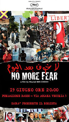 In occasione del quarantesimo compleanno della Fondazione Basso, l’associazione Amici della Fondazione Basso invita giovedì 19 giugno 2014, alle ore 20 alla proiezione del documentario “No more fear" (Mai più paura) con la presenza del regista tunisino Mourad Ben Cheikh. È il film che ha rivelato al mondo lo spirito e la straordinaria mobilitazione della rivoluzione tunisina “sia quella dei giovani e della loro rivoluzione virtuale sia quella dei più anziani che non hanno mai smesso di affrontare la paura per resistere al morso della dittatura”.