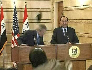"Jeter des chaussures à quelqu'un est considéré comme une insulte et un grave manque de respect dans le monde arabe", écrit l'érudit New York Times (16 décembre 2008). "Jeter des chaussures à quelqu'un est considéré comme l'insulte suprême dans le monde arabe et les chiens y sont perçus comme sales et dégoûtants", reprend le docte Washington Post (17 décembre 2008). Si un journaliste américain s'était amusé à jeter sa paire de chaussures à la face du président Bush au beau milieu d'une conférence de presse, comment cela aurait-il donc été considéré? Comme une simple badinerie? Si ce même journaliste s'était écrié en jetant de toutes ses forces le seul projectile à sa disposition, à savoir ses chaussures: "c'est l'adieu du peuple américain, espèce de chien! C'est pour toutes les veuves et orphelins de soldats morts en Irak…" Comment cela aurait-il été perçu? Comme une affectueuse blague?