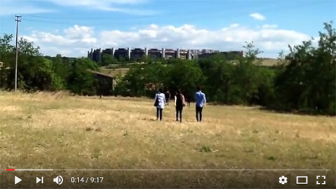 Si parte dunque a gruppetti, sempre in compagnia di qualcuno/a degli organizzatori. A indicarci la strada attraverso i campi verso un casale abbandonato che spunta sul crinale della collina è Arianna Esposito, che insieme a Tayisiya Libokhorska e Maria Aria Stadirani, tutte e tre iscritte a storia dell’arte all’Università Roma Tre, ha dato vita a un collettivo di curatrici d’arte dal nome evocativo: Matri-Pictoska, una matriosca decorata il loro simbolo.