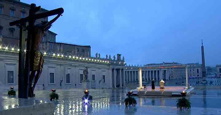 Rome 27 mars. Image inversée du film de Nanni Moretti, Habemus Papam, le pape François se tient seul, sous une guérite battue par la pluie, dressée sur le silence luisant du parvis. A l’arrière : la basilique Saint-Pierre, impassible...