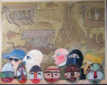 Ses peintures qu’elle expose aujourd’hui à la Galerie europia font cohabiter différents mondes, religions, cultures et civilisations. La Syrie y est souvent évoquée derrière les traits gris et rugueux des statues de Mari. Celles-ci voisinent alors avec d’autres personnages vivants ou inanimés, d’époques plus ou moins lointaines, plus ou moins certaines. Lorsqu’ils ne s’ignorent pas les regards de ces figures se croisent, s’étonnent de partager le même espace sur la toile.