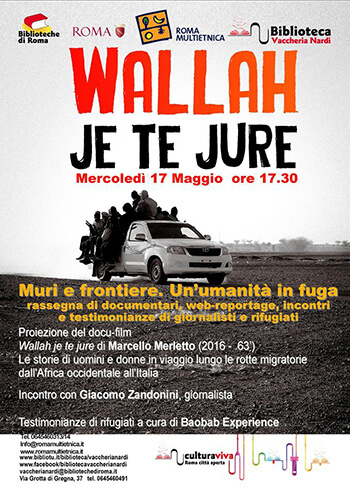 Cominciamo mercoledì 17 maggio alle ore 17.30 presso la Biblioteca Vaccheria Nardi, via Grotta di Gregna 37 (Metro B S.M.del Soccorso), con La rotta africana. Sarà proiettato il docu-film Wallah je te jure,di Marcello Merletto (2016, 63’ - in lingua originale con sottotitoli in italiano). A seguire incontro con Giacomo Zandonini, giornalista e testimonianze di rifugiati a cura di Baobab Experience.