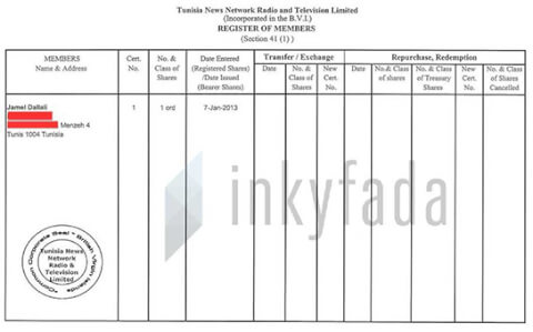 Janvier 2013. Plusieurs documents du cabinet Mossack Fonseca font état de la création d’une société dans les Îles Vierges britanniques, dont le directeur et unique actionnaire connu est Jamel Dallali. Cette société s’appelle “Tunisia News Network Radio and Television Limited”. M. Dallali indique alors être domicilié à El Menzah, dans la banlieue de Tunis.