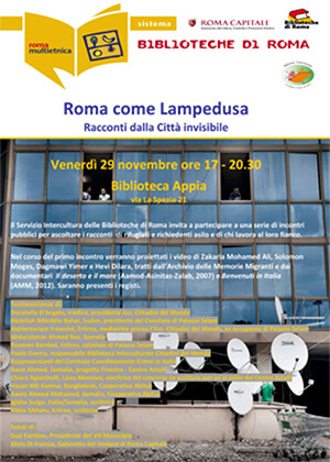 Le Biblioteche di Roma, in seguito ai drammatici avvenimenti di Lampedusa, hanno dato vita a una serie di iniziative di solidarietà e di sensibilizzazione. Tra queste l'iniziativa Roma come Lampedusa. Racconti dalla Città invisibile che affronterà in diverse biblioteche il tema delle migliaia di rifugiati e di richiedenti asilo invisibili, abitanti dei tanti insediamenti informali e di fortuna, in condizioni di vera emarginazione.