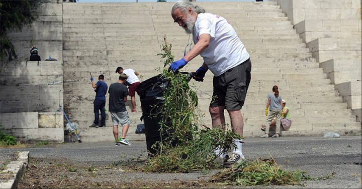 Le 15 juin dernier adultes et enfants ont déracinéles mauvaises herbes et retiré les ordures entre Ponte Milvio et le Pont de la Musique pour récupérer un espace urbain complétement abandonné. Credits: Retake Roma.