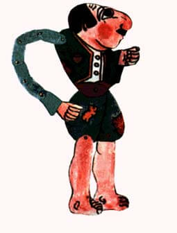 Comme pour notre Guignol, dont des versions édulcorées ont parfois fait oublier le caractère subversif qu’il avait à l’origine, ce théâtre a pris le nom de son protagoniste, Karaghiozis (le mot signifie œil noir en turc), né à l’époque de la domination ottomane. Homme du peuple laid et bossu, aux mille métiers et aux mille misères, pauvre ainsi qu’en attestent ses vêtements rapiécés, imbattable dans l’art de se faire prendre pour un demeuré, Karaghiozis est le représentant du peuple opprimé qui saura par la ruse triompher des puissants, et lorsque les dernières guerres ont amené en Grèce d’autres envahisseurs que les Turcs, les pièces les plus anciennes du répertoire ont soudain pris des accents de résistance nationale, mettant en œuvre des allusions, des sous-entendus totalement incompréhensibles pour les censeurs étrangers mais que le public grec recevait avec une jubilation vengeresse.