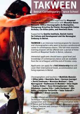 Takween is an intensive training program for dancers and choregraphers who wants to pursue a professional career in contemporary dance. This full-time intensive training program will be offered over a period of three months at Maqamat Studio in Beirut, Lebanon.