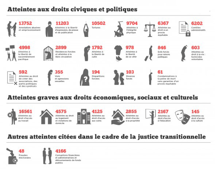 L’Instance Vérité et Dignité a considéré le viol comme la deuxième violation des droits humains la plus grave après l’homicide volontaire. Son indemnisation a été fixée à 140 mille dinars (soit 75% d’atteinte à l’intégrité de la personne) alors que l’homicide (100 % d’atteinte) se traduit par une réparation financière de 200 mille dinars.