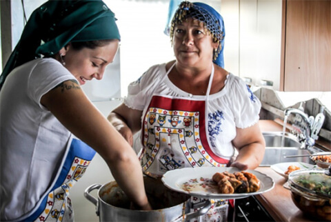 Giovani e meno giovani, serbe, bosniache, macedoni, rumene e italiane, hanno cucinato fianco a fianco per una ventina di ospiti lo scorso 25 giugno nel campo di Candoni, nella periferia sud di Roma. Il menù proponeva piatti tipici della tradizione culinaria balcanica: sarma, peperoni ripieni con carne macinata e riso, involtini di verza, insalata russa e per finire biscotti e dolci.