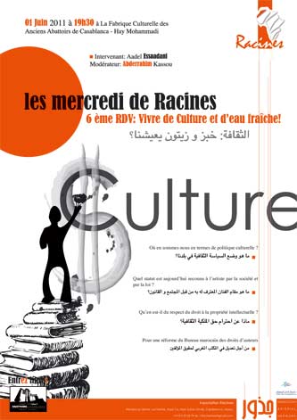 L'association Racines pour le développement Culturel au Maroc et en Afrique organise, dans le cadre de son rendez-vous mensuel ''Les Mercredi de Racines'', un sixième débat sur le thème "Vivre de culture et d'eau fraiche'' le mercredi 1er juin 2011 à 19h30 à la Fabrique Culturelle des anciens abattoirs de Casablanca . L'intervenant de ce mercredi sera Aadel Essaadani, président de Racines, militant associatif, acteur culturel casablancais et directeur de l'Institut des Métiers du Spectacle. Il milite depuis des années pour la défense de la culture en tant que droit humain fondamental et vecteur économique incontournable, ainsi que pour la mise en place d'une véritable politique culturelle et l'émergence d'une industrie creative pour les artistes au Maroc. Nous aborderons avec lui des questions en rapport avec la politique culturelle marocaine, le statut de l'artiste, le droit de la propriété intellectuelle. Le débat sera modéré par Abderrahim Kassou.