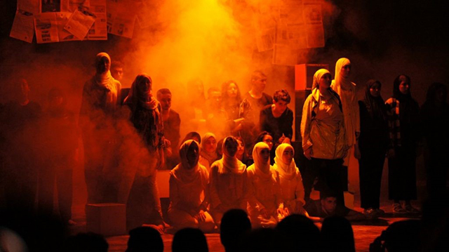Le lendemain, le théâtre Mohamed El Haddad, non loin du lycée, est plein à craquer. L’agitation est forte dans la salle, le spectacle intitulé « Finir la table » sur lequel les élèves ont travaillé près d’un an est sur le point de débuter. Sur scène les 41 élèves se déplacent avec grâce et sans accroc. Les rapports amoureux ou de façon générale les relations hommes/femmes et le patriarcat sont au cœur de leur pièce.